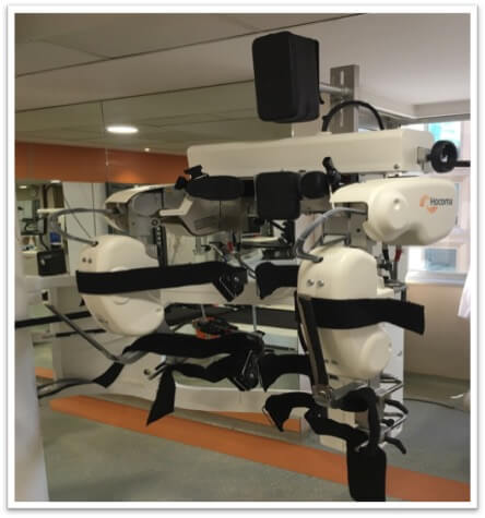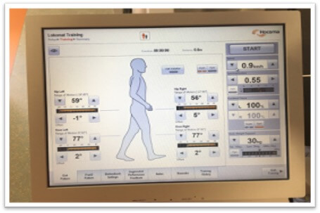 Robotik yürüme cihazı; güç kaynağından, bir vücut ağırlığı destek sisteminden ve bir koşu bandından oluşur (Resim 1). Hastalara üst gövde kısmı için korse bağlama sisteminden oluşan bir tür korse takımı giydirilir. Ağırlıksız bu sistem, eklemlere aşırı yük binmesini ve omurga problemlerinin oluşmasını önler. Hastaların gövde ve bacakları cihaza geçirildikten sonra motor eksenlere yerleştirilip desteklenmektedir (Resim 2). Cihazın bacak destek aparatları kişinin bacak boyuna göre ona özel ayarlanmaktadır. Cihazın hastaları ve onların bilgilerini kayıt ettiği ve hasta takip etmeyi kolaylaştırıcı bir ekranı bulunmaktadır (Resim 3).