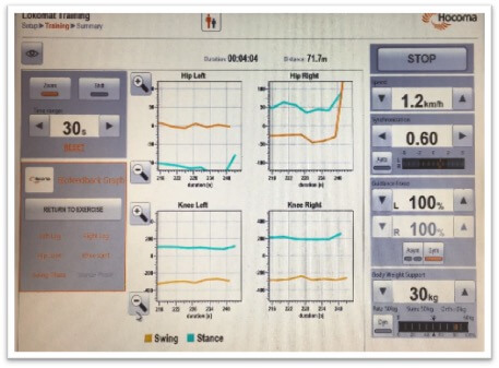Hasta yürüme cihazında yürürken hastanın motivasyonunu, katılımını arttırmak ve aktif hareket artışını sağlamak amacıyla görsel bildirimlerden ve sanal gerçeklikten faydalanılır. Hastanın uygunluğuna ve uyumuna göre kalça ve diz aktif hareketlerinin grafiği seans boyunca hastanın karşısında yer alan ekranda açık tutulabilir (Resim 5). Ya da hastanın ilgisini çeken amaca yönelik bir oyun ile çalışmaya katılması sağlanabilir (Resim 6). Bu sayede hasta doğru yürüme paterni ile güvenli ve aktif katılmaya çalışarak yürüme çalışması yapmış olur.